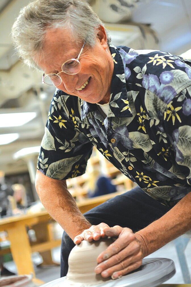 Now retired from teaching, Butch produces ceramics out of his home studio, “Planet A Clay.” His studio uses renewable energy from wind to fuel his kilns. You can often identify one of Butch’s pieces from his signature teal-colored glazes and his use of unique shapes.