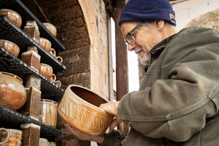 Woodfired pots have always captured Jeff’s attention, and in 2011, he decided it was time to head in that direction. Jeff credits Linda Christensen for her valuable input on the kiln he built and for running the first wood firing with him. Jeff’s pottery is all microwave, dishwasher, and oven safe. His glazes are non-toxic and safe for food use; this is why his color palette is mostly browns, grays, and oranges.