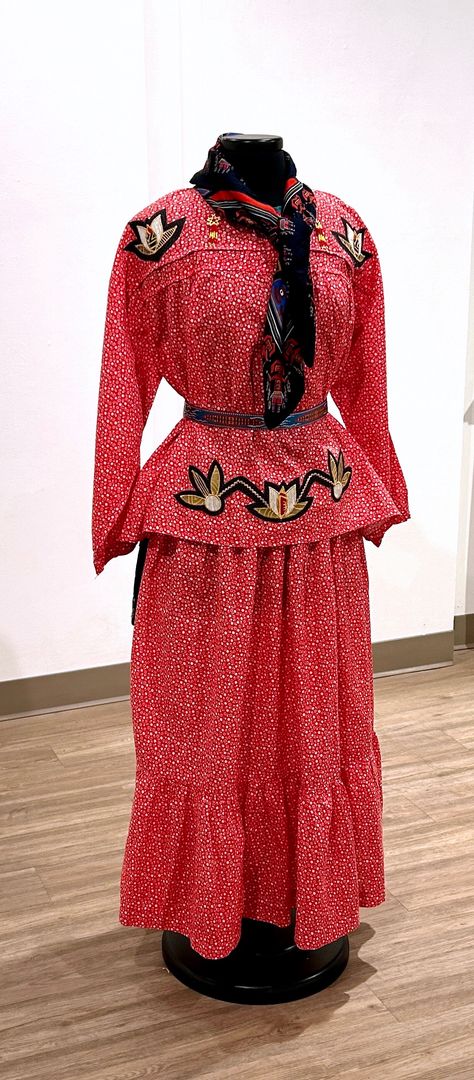 upcycled cotton dress, Ojibwe floral applique, leather belt, cotton scarf, African block print cotton