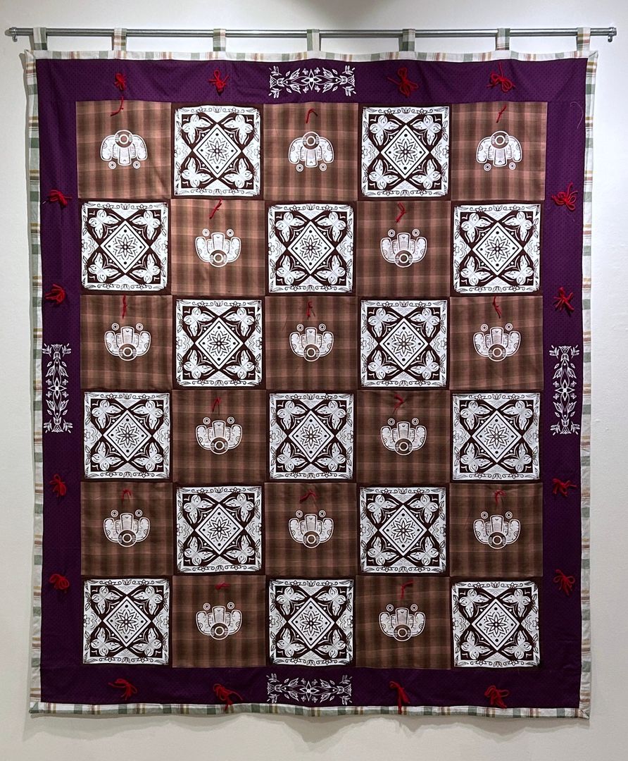 100% cotton, screenprinted panels 80 in x 68 in x 00.25 in / 203.2 cm x 172.72 cm x 00.64 cm