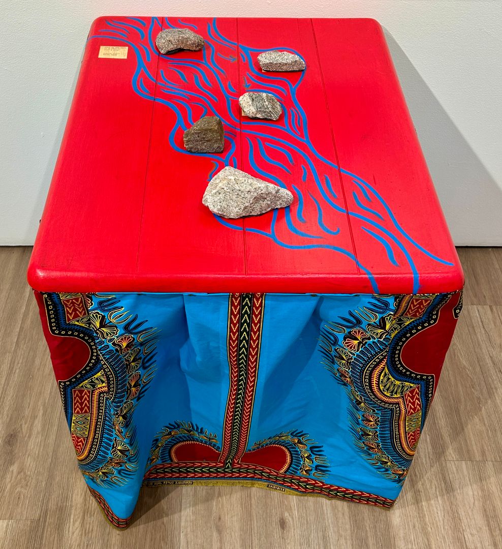 upcycled table, acrylic paint, railroad stones from Virigina, wax print fabric, typewriter poetry