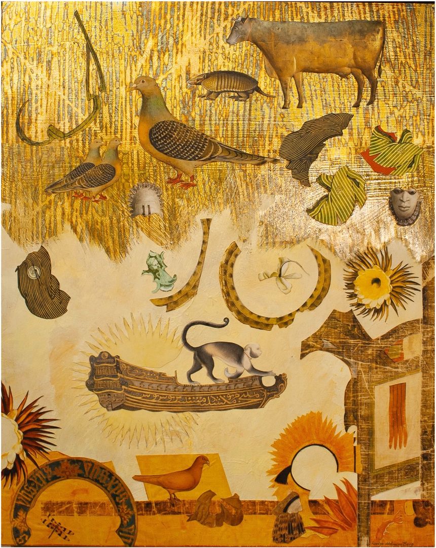 hand-cut paper, metal leaf, and acrylic paint on ClayBoard